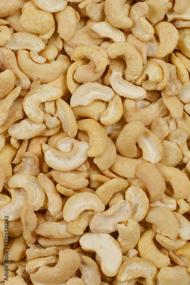 A close-up shot of a pile of raw cashews, displaying their natural texture and light beige color