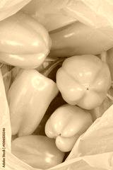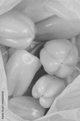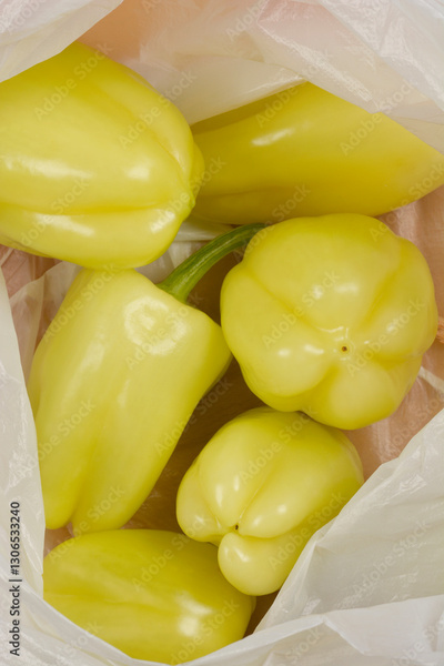 Several pale green bell peppers are placed inside a white plastic bag, showcasing their fresh appearance and natural texture