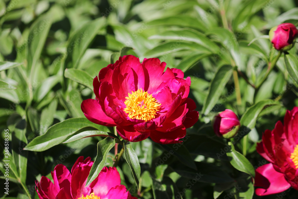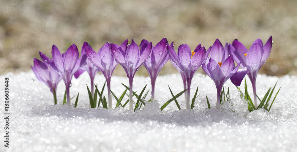 Purple crocuses on a background of glittering snow, beautiful spring flowers. Template for a card for Easter and Mother's Day.