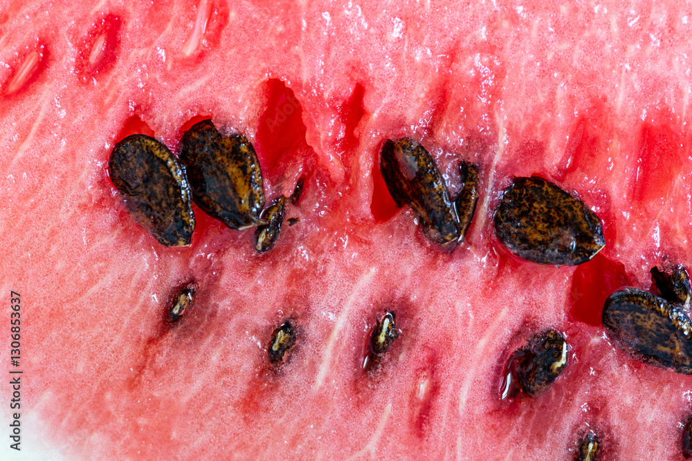 Macro view juicy bright red watermelon with black seeds on a white plate. Close-up
