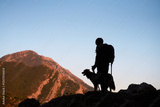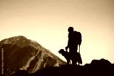 A hiker and a Border Collie stand together on a mountain summit, silhouetted against the sunset. The scene captures the bond between dog and human, framed by the beautiful mountain view.