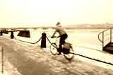 A person cycles on a path beside a frozen river in St-Petersburg in winter