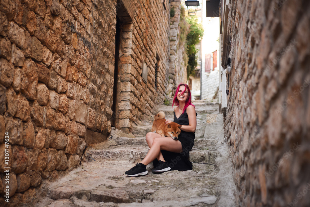 A person with vibrant pink hair sits on stone steps holding a Shiba Inu in a serene medieval alley. The rustic textures of the walls and steps add to the historic charm.