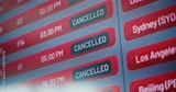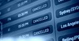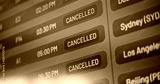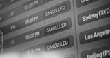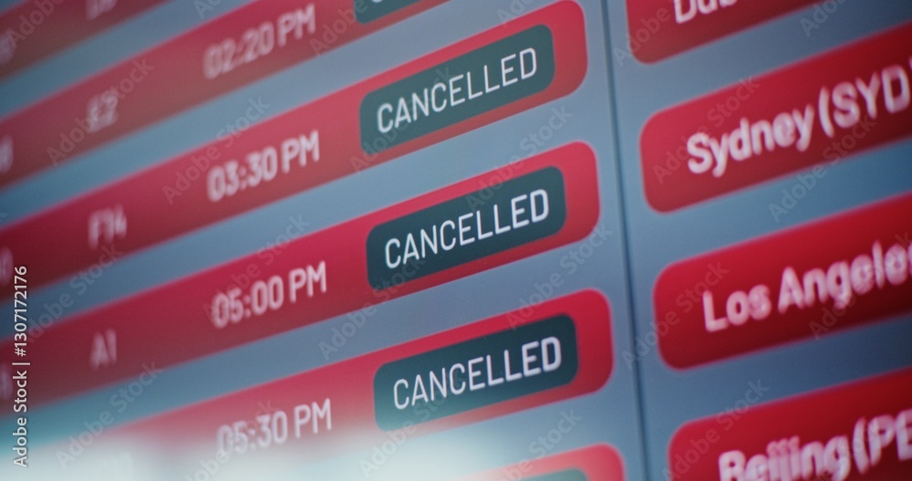 International Airport Terminal: Close Up of Digital Arrival and Departure Information Display Showing Flight Data For Travelers. Cancelled Flights Due to Bad Weather Conditions or Terrorist Attack.