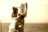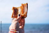 Pieces of dried smoked fish pike in a female hand against the background of the sea and blue sky close-up, relaxation on the beach, beer snack.