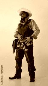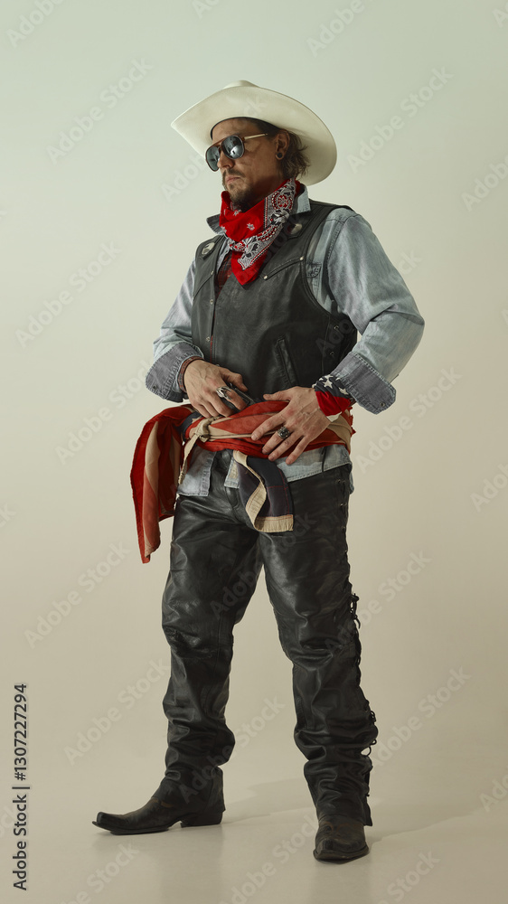 Confident man, cowboy in western outfit, gripping belt while looking to side, wearing white hat, sunglasses, and American flag against warm background. Concept of USA traditions, social issues
