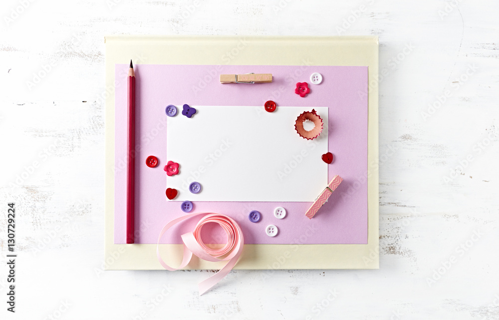 Assorted colorful craft supplies on white wooden background