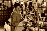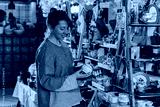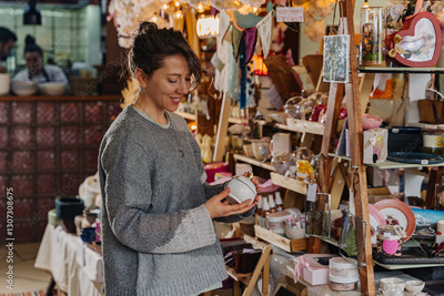 Woman shopping for unique handmade items at craft fair. Variety of handmade crafts and decorations at local fair.