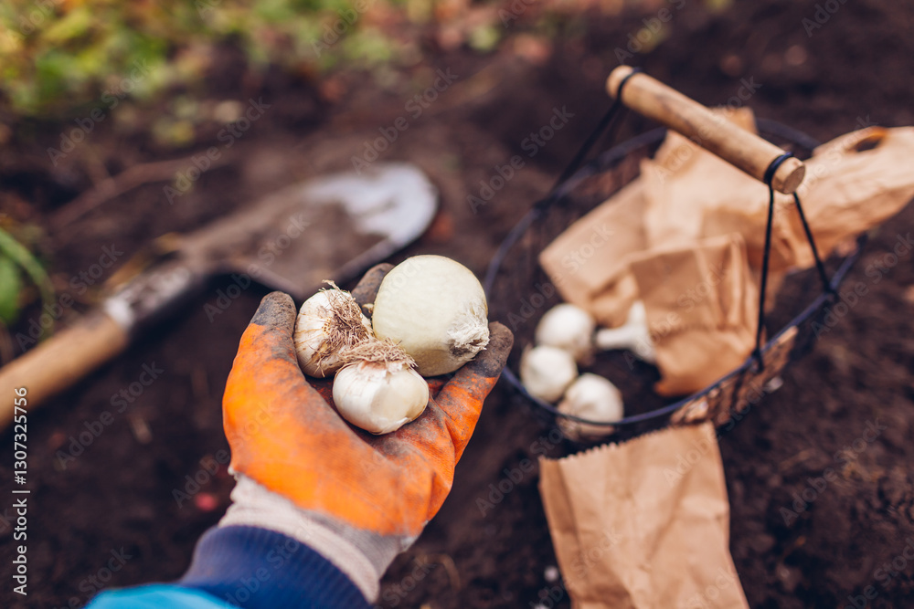 Fall planting. Gardener planting allium bulbs and bare rooted peony tubers in soil in autumn garden using shovel.