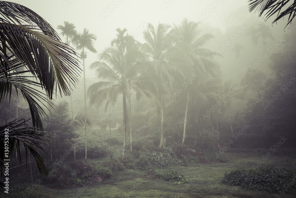Sunlight rays pour through leaves in a rainforest at Sri Lanka