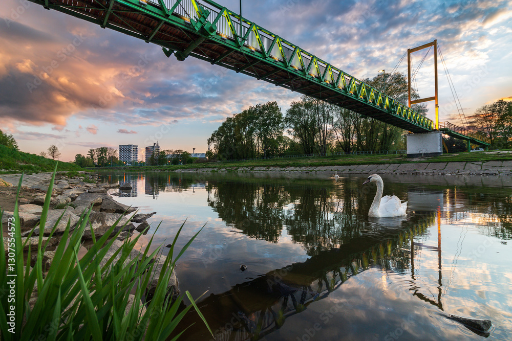 A scenic view of the Piesza Kładka pedestrian bridge over the Wisłok River in Rzeszów, Poland. The modern structure elegantly spans the river, offering a picturesque walkway.