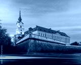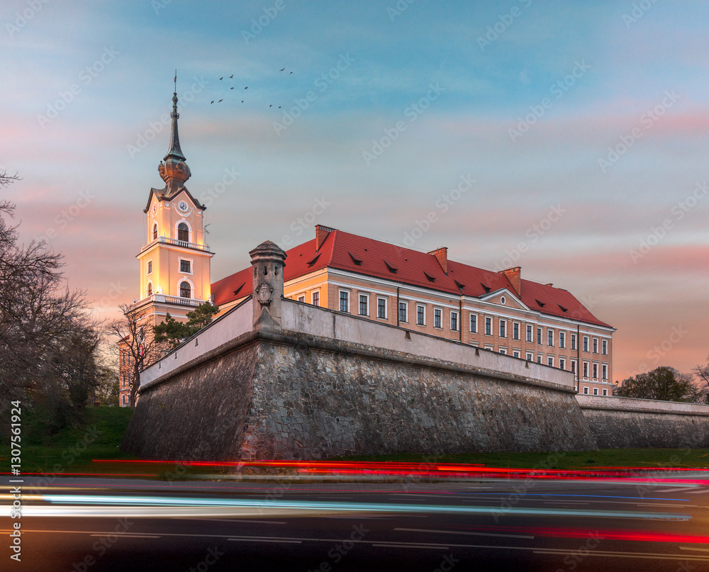 Zamek Lubomirskich in Rzeszów, Poland, illuminated by the golden hues of sunset. The historic castle stands majestically, blending elegance with the peaceful evening atmosphere.