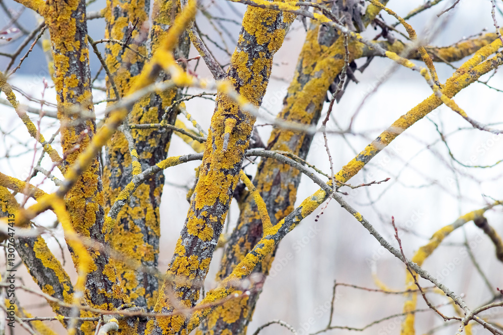 Tree branches covered in bright yellow lichen, close-up, with emphasis on the texture and details of the lichen