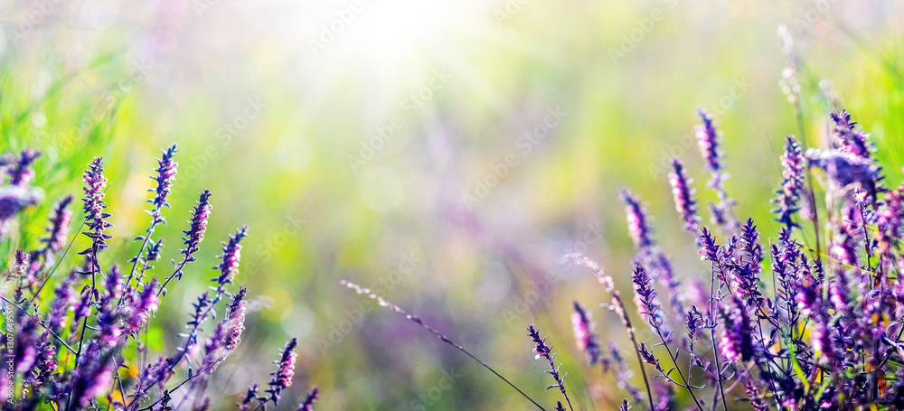 Lavender (Lavandula) with purple flowers, illuminated by sunlight breaking through the grass, with a blurred background