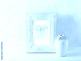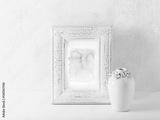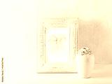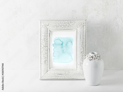 An arrangement of an abstract watercolor picture and a vintage vase
