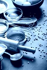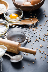 Baking ingredients. Bowl, eggs, flour, eggbeater, rolling pin an