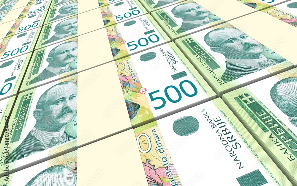 Serbian dinar bills stacks background. 3D illustration.
