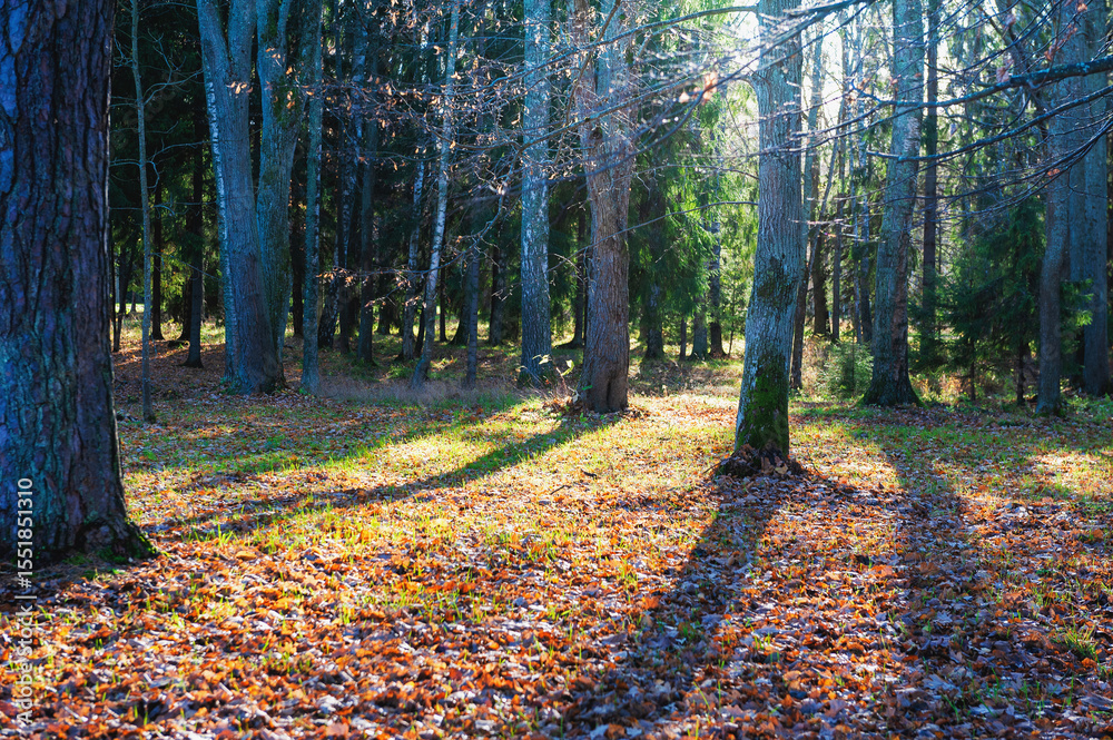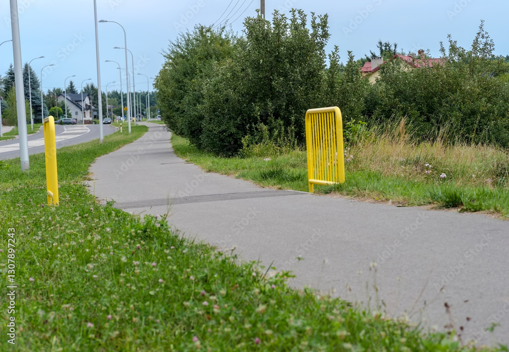 Chodnik w części miasta (Ostrowiec Św) bogatej w drzewa i inną roślinność w letni dzień. Zakręcająca ścieżka rowerowa z bujną zieloną trawą i gęstymi krzewami, z żółtymi barierami i latarniami wzdłuż.