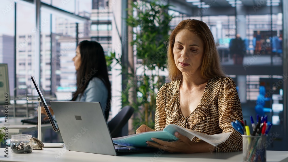 Business sales manager at work finalizes strategy planning in her office, doing report writing and answering emails. Worker collaborates on project management, uses data to drive decisions. Camera A.