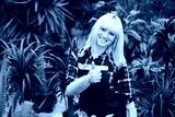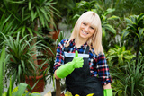 Portrait cheerful woman gardener wearing protective gloves showing thumbs up. standing in a garden center