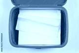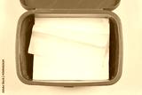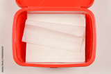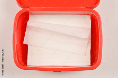 A top-down shot of an open red plastic container with a stack of white, thin, and slightly translucent sheets of moist toilet paper inside, against a neutral background