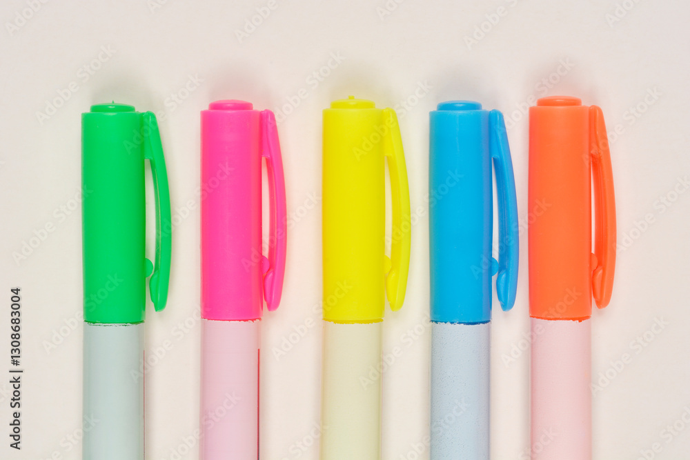 A close-up, frontal shot of five colorful markers with caps on, arranged in a row against a light background