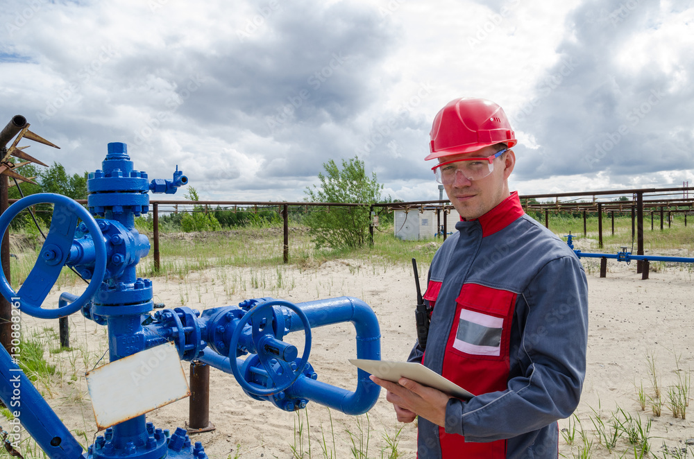 Worker near broken pump jack holding radio and tablet computer in the oilfield. Pipeline background. Oil and gas concept.