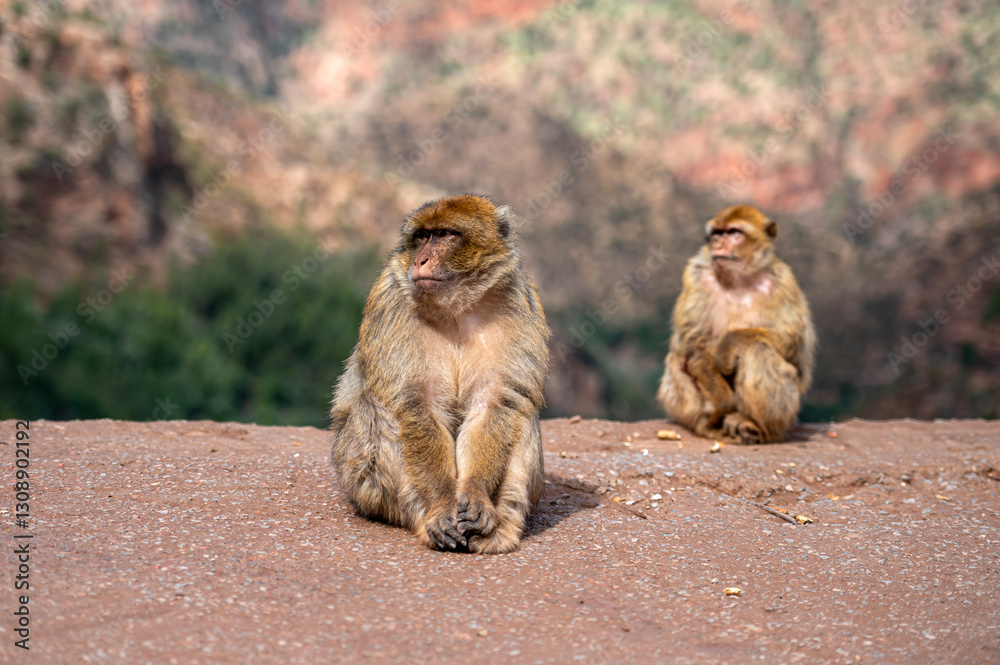 Barbary macaques resting on a rocky landscape in Morocco's natural habitat