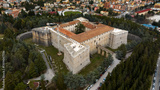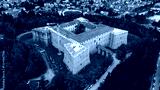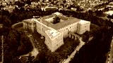 Aerial view of the Spanish Fort in the historic center of L'Aquila, Abruzzo, central Italy. The Spanish Fort is a medieval and quadrangular castle.