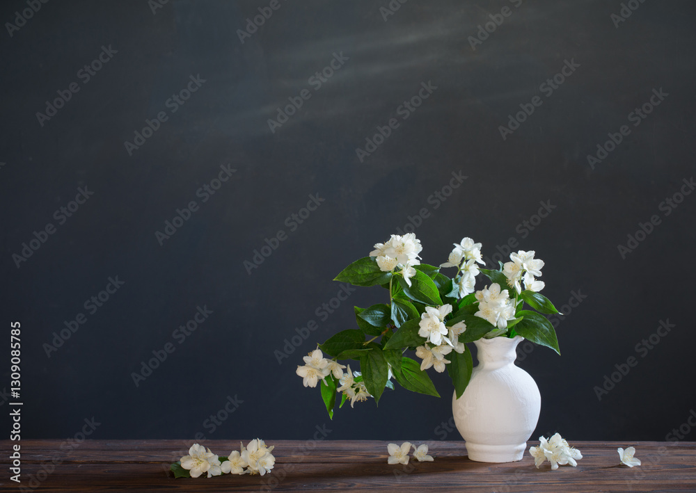 jasmine flowers in ceramic vase on white background