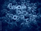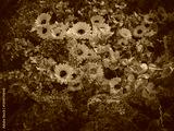 Artificial flowers, including sunflowers and hydrangeas, are arranged together in a moody, slightly dark, decorative display.