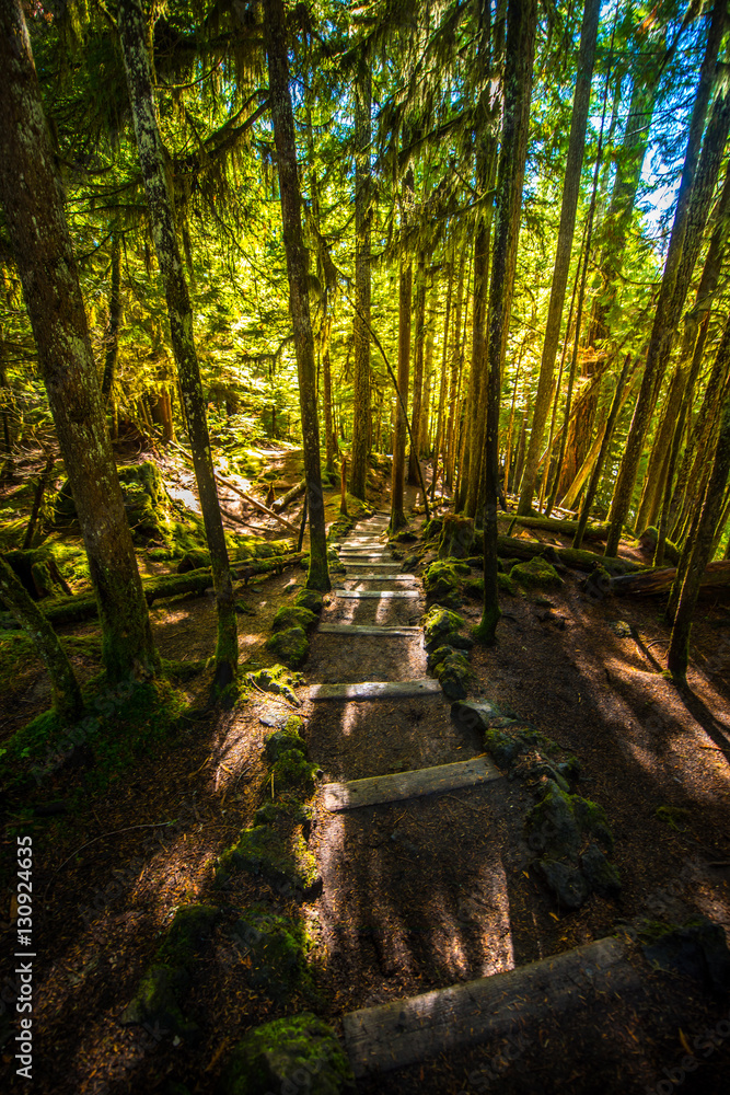 Sahalie Falls Trail Wooden steps leading down to McKenzie river