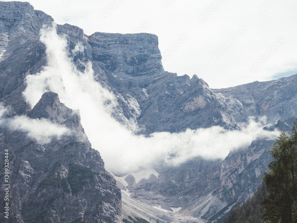 Imponentes montañas rocosas con nubes bajas en paisaje alpino
