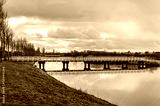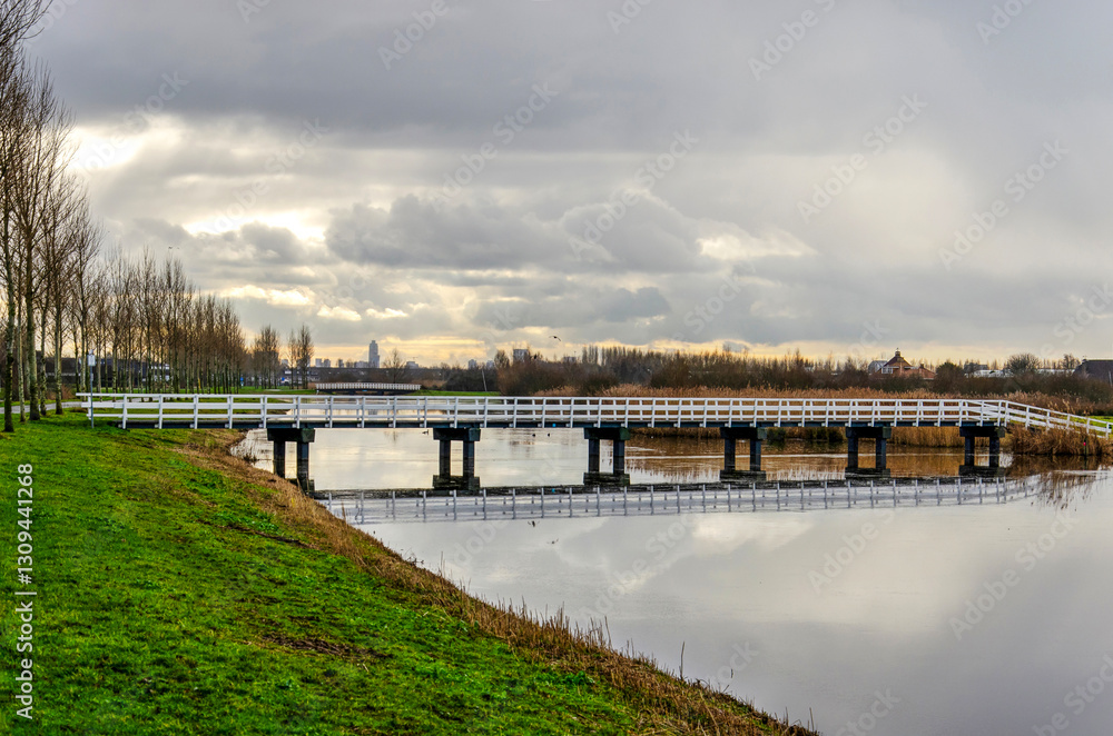Lansingerland, The Netherlands, January 12, 2025: wooden pedestrian bridge in Groenzoom recreation area with the skyline of Rotterdam in the distance