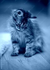 Gray fluffy striped kitten sits