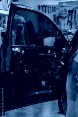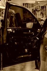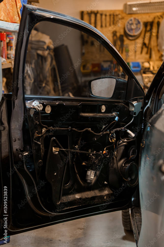 Close-up View of Car Door Interior with Exposed Parts and Workshop Background