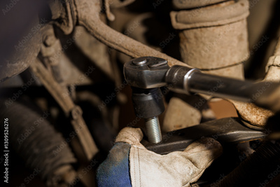 Close-Up of Mechanic Hand with Wrench Tightening Bolt on Vehicle Suspension System