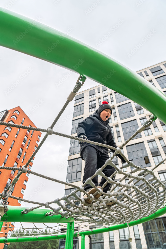 A child in warm clothes climbing a rope net on a playground surrounded by modern apartment buildings. Concept of outdoor activity in urban spaces