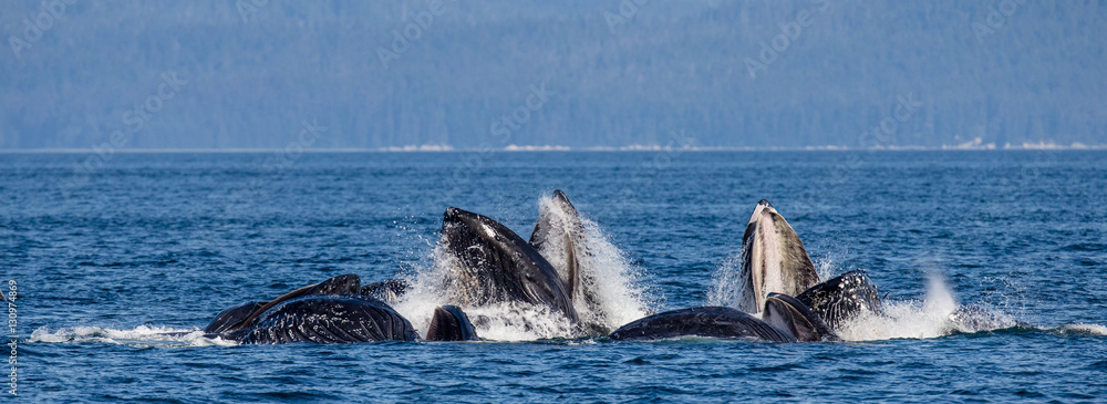 Humpback whales bubble net feeding. Chatham Strait area. Alaska. USA. An excellent illustration.