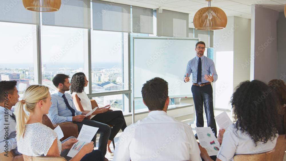 Businessman At Whiteboard Giving Presentation To Business Team Sitting Around Table In Modern Office