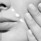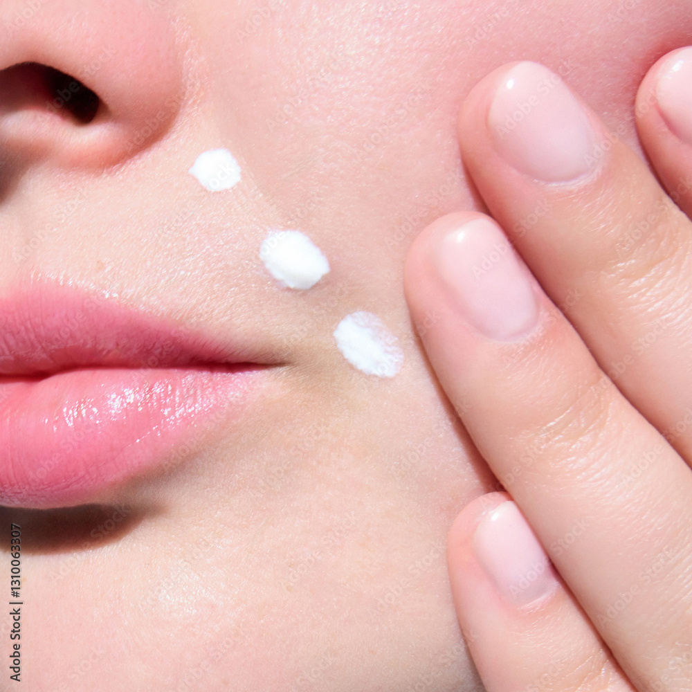 Skin care moisturizer. Skincare close-up beauty portrait of a woman applying retinol facial cream on nasolabian fold. Anti age wrinkles cosmetics.
