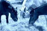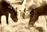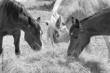Horses eating hay in spring pasture