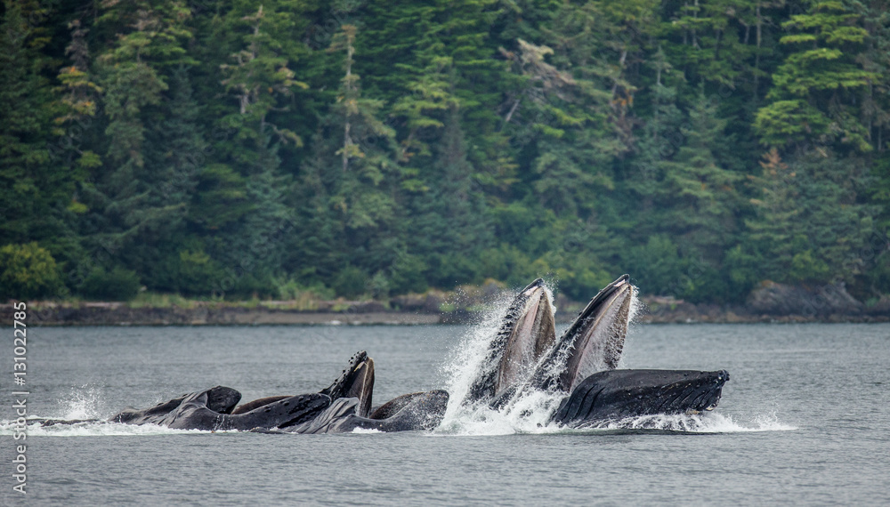Humpback whales bubble net feeding. Chatham Strait area. Alaska. USA. An excellent illustration.