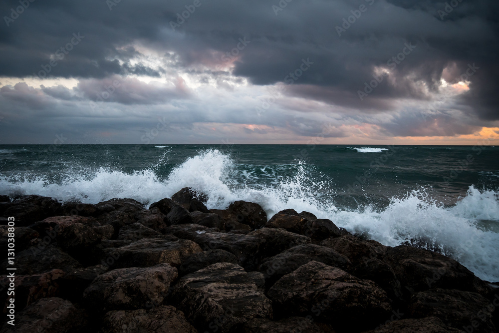 l'écume des vagues se fracassant sur les rochers noirs sous un ciel sombre