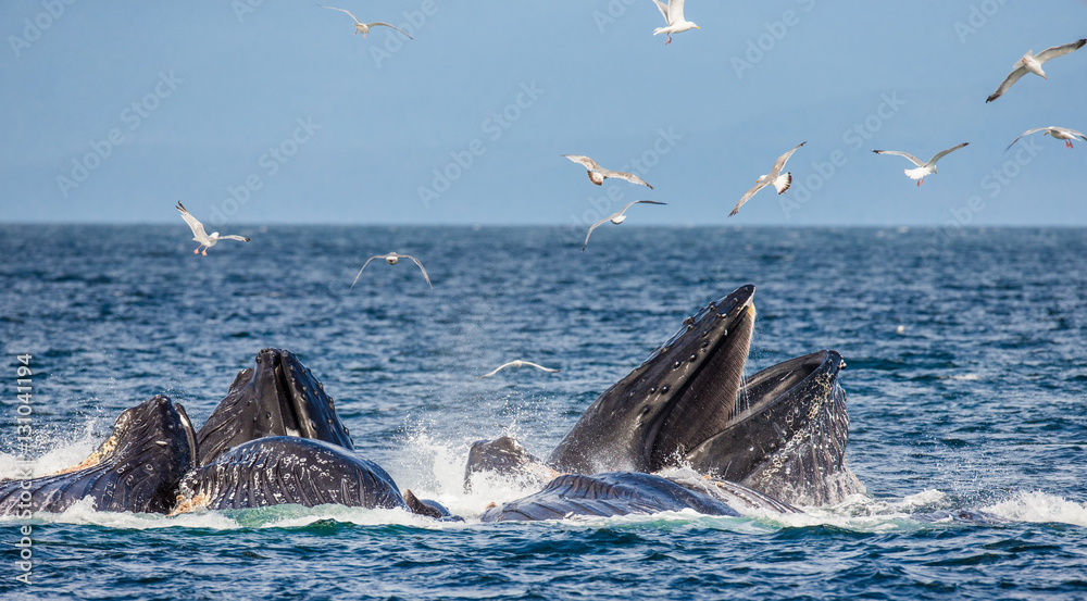 Humpback whales bubble net feeding. Chatham Strait area. Alaska. USA. An excellent illustration.