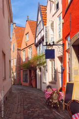 Narrow cobbled street in the historic Schnoor district of Bremen, with old houses, Germany