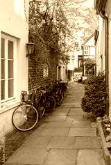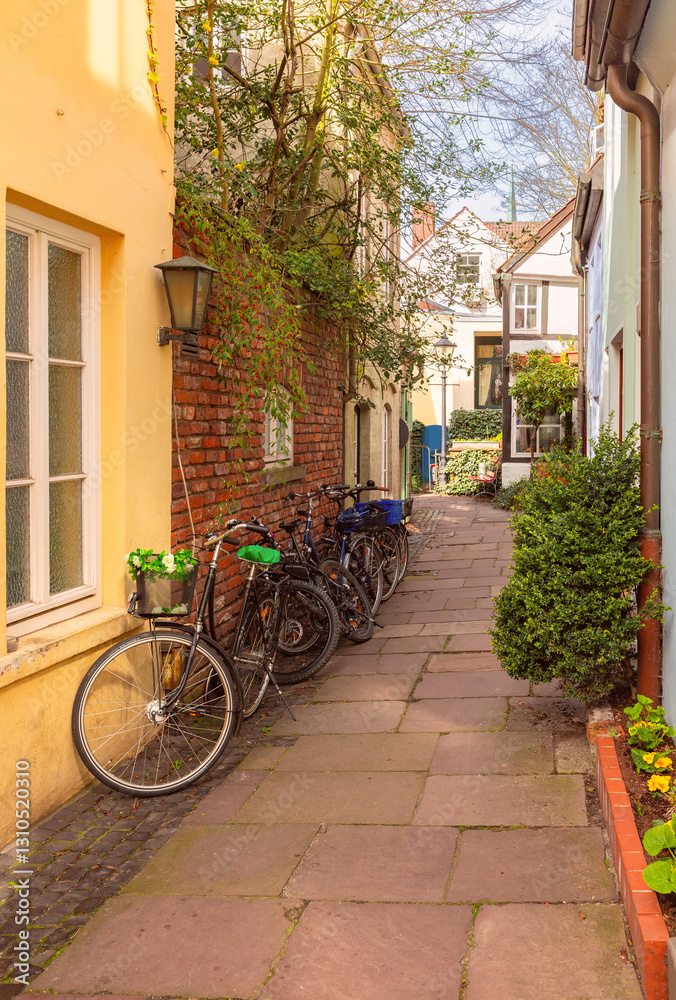 Narrow cobbled street in the historic Schnoor district of Bremen, with old houses, Germany