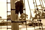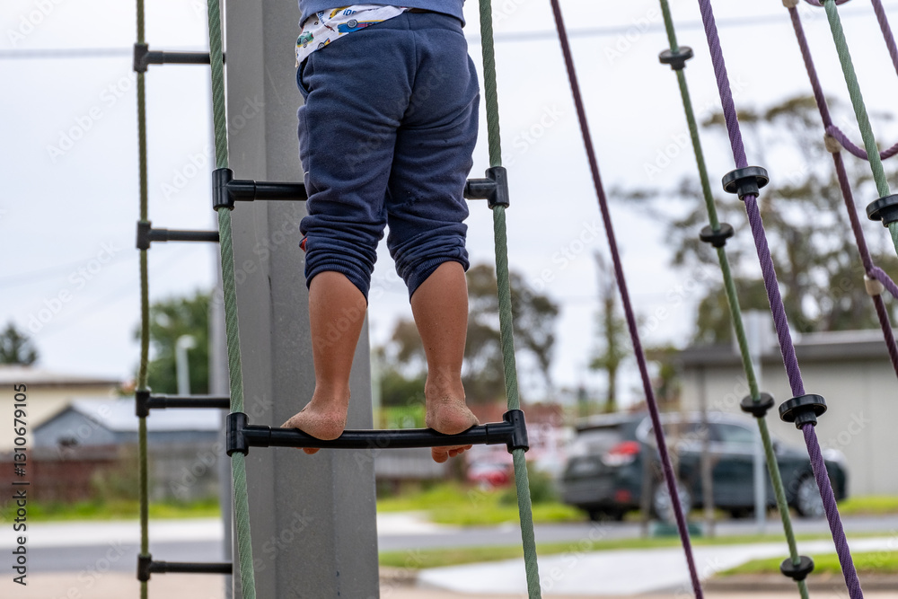 A five-year-old child's bare feet stand on a playground climbing structure or the ladder rung of outdoor play equipment, with ropes or other climbing elements in a suburban park.