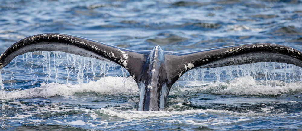 Tail humpback whale above the water surface closeup. Chatham Strait area. Alaska. USA. An excellent illustration.