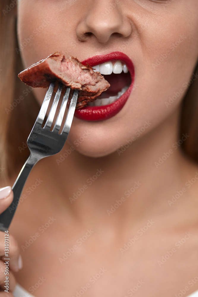 Eating Meat. Closeup Of Sexy Woman's Mouth Biting Tasty Meat